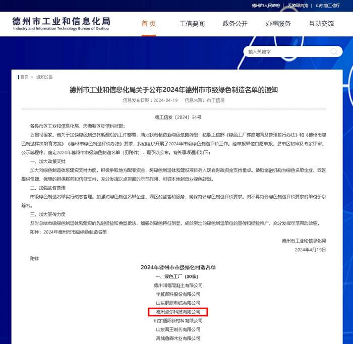 山東普利森集團(tuán)旗下德州卓爾科技有限公司獲評(píng)2024年德州市“綠色工廠”稱號(hào)
